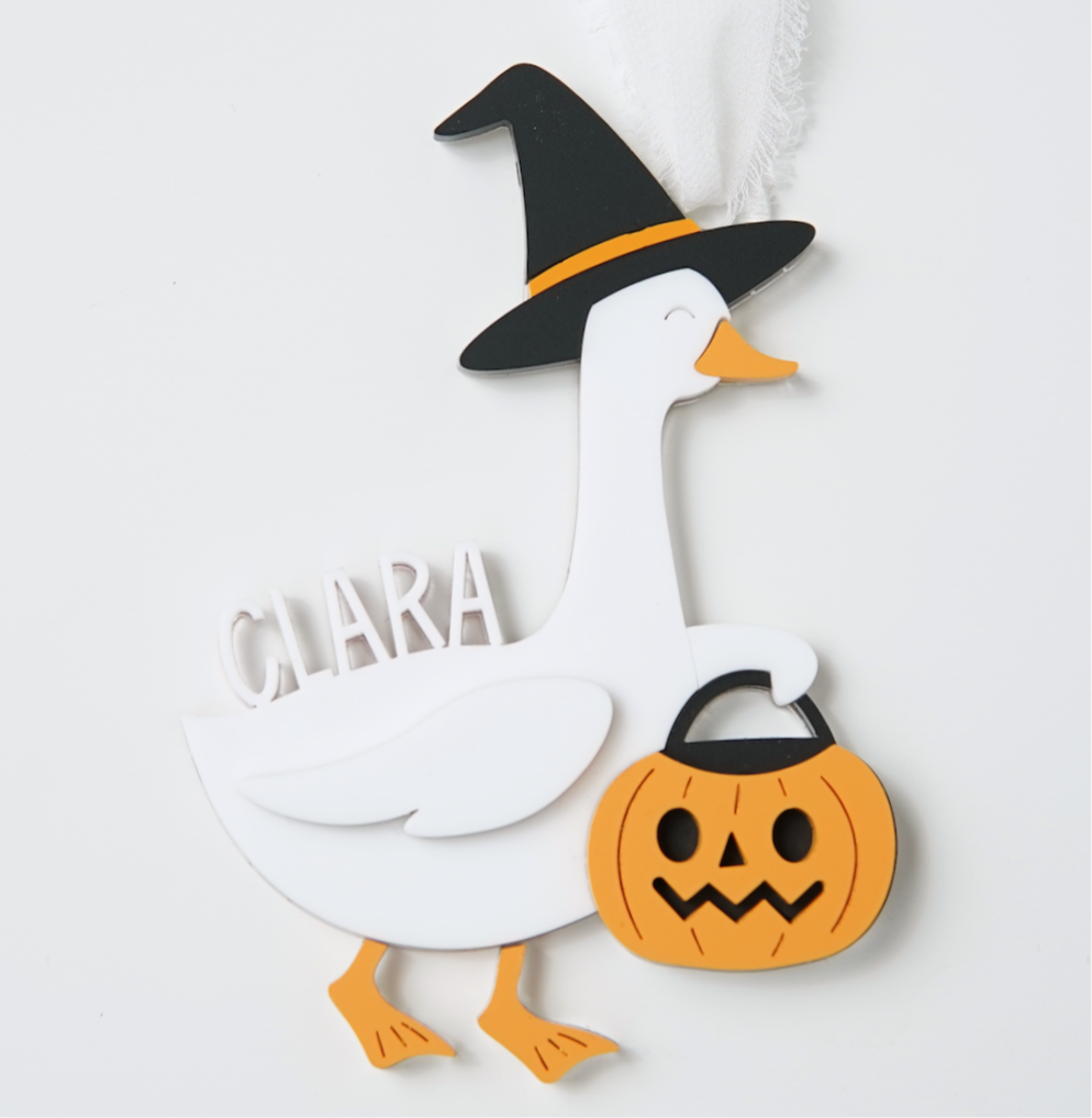 Add a touch of spooky fun to your child’s backpack or trick-or-treat bag with the Witchy Silly Goose Tag! Featuring a playful goose wearing a witch’s hat and carrying a trick-or-treat basket, this personalized tag can be customized with your child’s name for extra charm. Durable and easy to attach, it’s perfect for making their Halloween gear uniquely theirs while keeping track of their bag in a festive way.